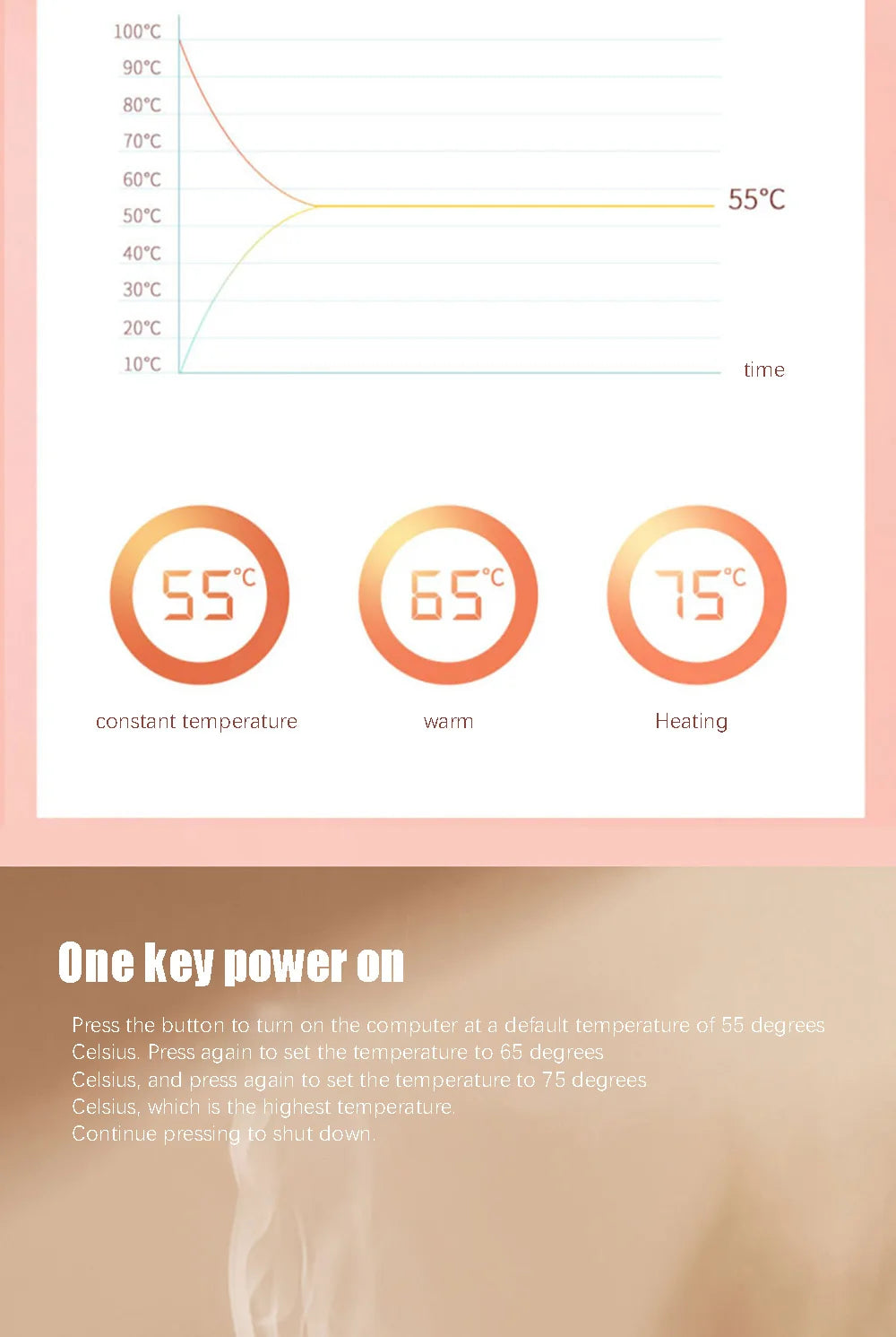 -Gently press the button to warm up for a whole day. Press the button to turn on the computer with a default temperature of 55 degrees Celsius. Press again to set the temperature to 65 degrees Celsius, and press again to adjust it to 75 degrees Celsius, which is the highest temperature. Continue pressing to shut down.