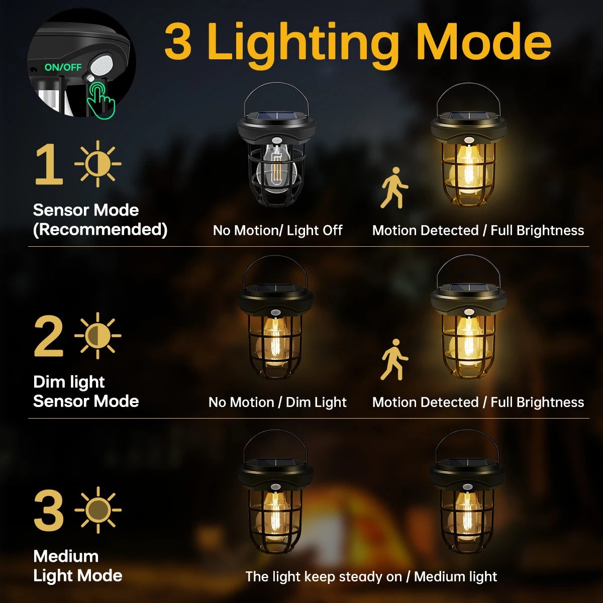 【3 working mode】--mode1:when people come by, it become strong bright, and off after people leave for a while